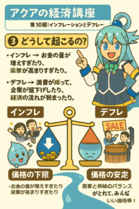 ・デフレ → 消費が減って、企業が値下げしたり、経済の流れが弱まったり。