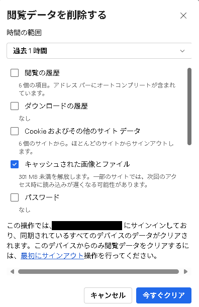 6.「キャッシュされた画像とファイル」をチェックし、それ以外の項目のチェックを外す。。