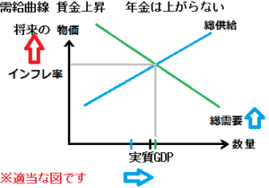 働いている人は賃金が上昇するのだが、老人の年金は量が増えないが、お金の量が増えるから総需要曲線は右へシフトする。